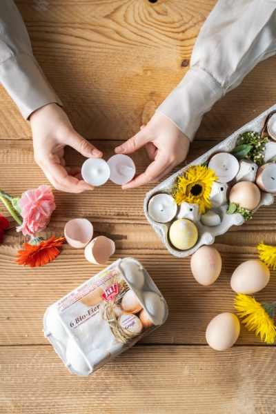 Was machst du mit deinen leeren Eierschalen? Verwende sie als besondere Tischdekoration vor und zu Ostern. Dazu einfach die halben Schalen vorsichtig reinigen, mit Teelichtern füllen und dann zusammen mit Frühlingsblumen oder -kräutern und anderen selbstgefärbten Eiern im Eier-Tragerl hübsch einordnen. So wird jeder Tisch zu einem Hingucker!