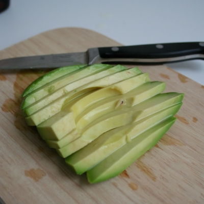 5Avocado schälen, entkernen und längs in gleichmäßige Scheiben schneiden. Sofort rundherum mit Zitronensaft benetzen, damit sie schön grün bleiben.
