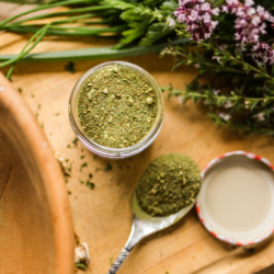 Zubereitung: Etwas Meersalz und die Kräuter werden in einer Küchenmaschine miteinander zerkleinert. Nach und nach wird das restliche Meersalz hinzugefügt, bis sich ein feines Gemisch ergibt. Dieses wird in hübsche Gläser gefüllt und mit einem hübschen Etikett versehen. Das Salz konserviert die frischen Kräuter und erhält das Aroma.