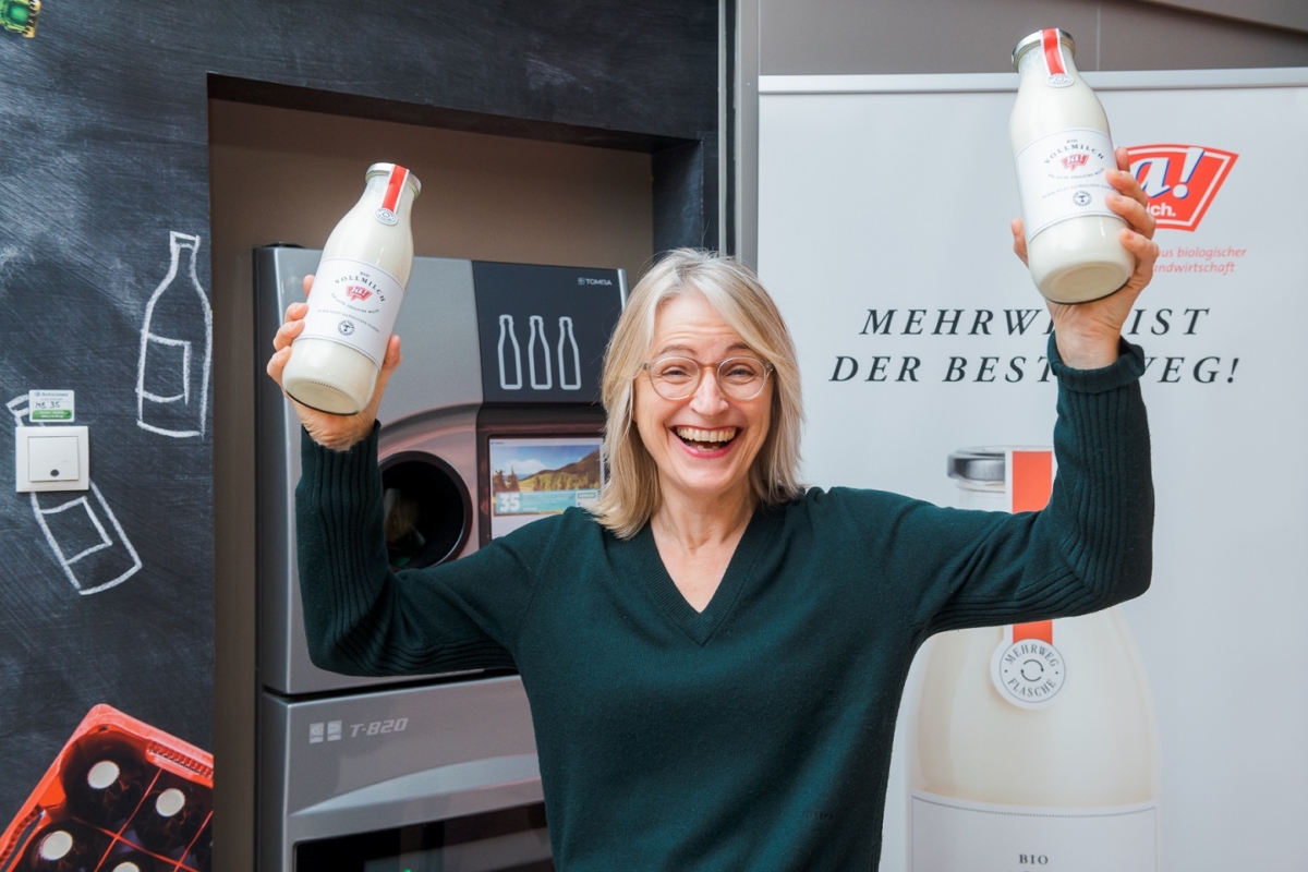 Bild 1 + 2: Ja! Natürlich Markenbotschafterin Martina Hörmer mit Milchglasflasche in Mehrwegvariante
