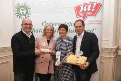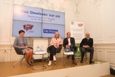 Gemeinsam mit der Tageszeitung „Die Presse“ lud Ja! Natürlich gestern zur Podiumsdiskussion „Das Gewissen isst mit – Nachhaltigkeit und Tierwohl in der Milchwirtschaft“. Angeregt und durchaus kontrovers diskutierten vor rund 100 Gästen – darunter auch viele Bäuerinnen und Bauern – im Vienna Ballhaus der Landwirtschaftskammer-Präsident Josef Moosbrugger und Theresia Neuhofer, Bio-Landwirtin der ersten Stunde und ehemalige Abgeordnete zum Salzburger Landtag mit den Geschäftsführern von Ja! Natürlich Martina Hörmer und Andreas Steidl. Ausgangspunkt war das Spannungsverhältnis zwischen hohen Kundenerwartungen in Sachen Tierwohl – denen Ja! Natürlich mit weit über den gesetzlichen Vorschriften liegenden Standards und Auflagen begegnet – und den unterschiedlichen Positionen der Landwirtschaft in dieser Frage.