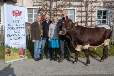 Seit 2009 unterstützt Ja! Natürlich das Zuchtprogramm der ARGE Pinzgauer Rind für den Fortbestand dieser traditionsreichen österreichischen Zwei-Nutztierrasse, die aufgrund der fortschreitenden Verdrängung durch Hochleistungsrinder als gefährdet eingestuft ist. Über 5.400 Tiere konnten mit dieser Unterstützung schon gezüchtet werden. Mit der Ersteigerung des prächtigen 14 Monate alten Pinzgauer-Zuchtstieres „Ginster“ beim traditionellen Herbststiermarkt im Salzburger Maishofen wurde diese 10-jährige Partnerschaft gefeiert. Der weit über die Grenzen Österreichs bekannte Rindermarkt im November zieht Jahr für Jahr nicht nur tausende Besucher aus dem gesamten Alpenraum in seinen Bann, er steht auch für das Herz der Pinzgauerzucht. Anlässlich des Jubiläums prämiert Ja! Natürlich in diesem Jahr auch die Käufer der 38 reinrassigen Pinzgauer Milchkühe mit einem Jubiläumszuschlag. Und wie jedes Jahr ließen sich die Ja! Natürlich Geschäftsführer Martina Hörmer und Andreas Steidl die Ersteigerung des begehrten Elitestiers nicht entgehen.