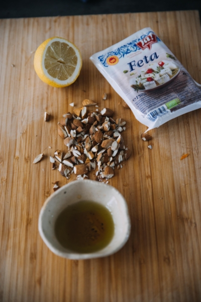 4Das restliche Olivenöl mit dem Saft der Bio-Zirone und 1 EL Ahornsirup vermischen und gemeinsam mit den Mandeln und Dörrmarillen untermischen.