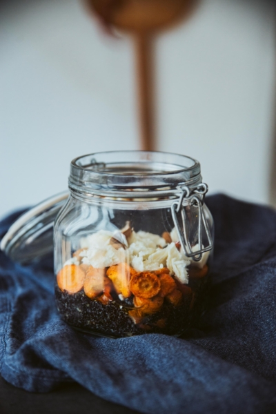 5Nun zuerst den Amaranth in die vorbereiten Gläser schichten. Die Gewürzkarotten darauf verteilen und mit zerbröseltem Feta bestreuen.