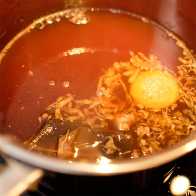 2Den Saft bis auf die Hälfte seiner Menge einreduzieren und mit dem übrigen Saft aufgießen. Zusätzlich gesamte Wassermenge hinzufügen.