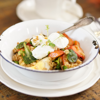 5Den fertiggekochten Dinkelreis mit dem Vogerlsalat und den Erdbeerscheiben vermischen.