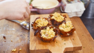 2Für die Specknester ein Muffinblech umgedreht auf die Arbeitsfläche legen. Den Bauchspeck um die Muffinformen wickeln und für ca. 10 Minuten bei 180° C backen. Der Speck sollte schön kross sein.
