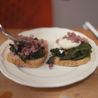 5Jetzt wird angerichtet! Auf dem Toastbrot den Spinat, Speck und die pochierten Eier drapieren. Oben drauf kommt etwas Kürbiskernmayonnaise und Kürbiskerne zur Deko.