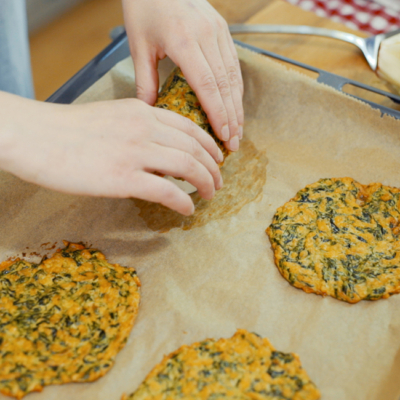 2Das Mehl, die Eier und den Käse vermengen. Die Masse zu vier runden Tacos auf einem Backblech mit Backpapier so dünn wie möglich legen, damit sie sich später besser in die Tacoform biegen lassen.