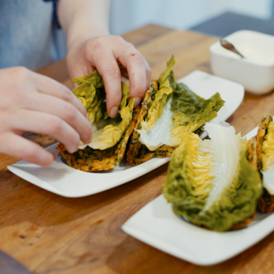 5Die erkalteten Tacos mit Joghurt, Salatherzen und Schnittlauch belegen. Mit Salz und Pfeffer abschmecken.