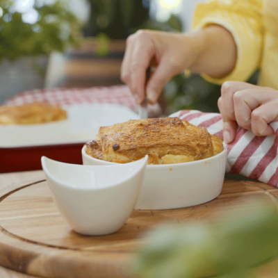 In einer kleinen Schüssel ein paar Löffel Apfelmus anrichten und zum Auflauf servieren.