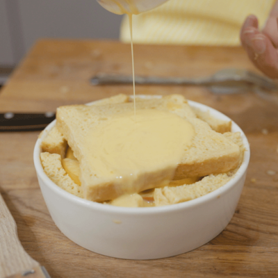 4Das Toastbrot je nach Form ganz, halbiert oder geviertelt in die Milch-Eier-Mischung tauchen, gut vollsaugen lassen und damit den Boden sowie die Seitenränder auslegen.