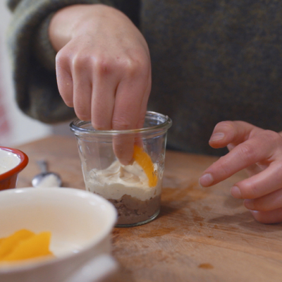 4Jetzt geht es ans Schichten! Maroni-Creme abwechselnd mit Topfen und Orange in ein Glas schichten, oben drauf eine Prise Zimt streuen.