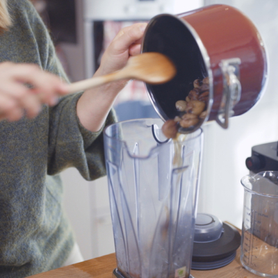 2Nun die Maroni in den Zuckersirup erhitzen. Danach alles in einem Hochleistungsmixer mixen, bis eine cremige Masse entsteht. Jetzt abkühlen lassen.