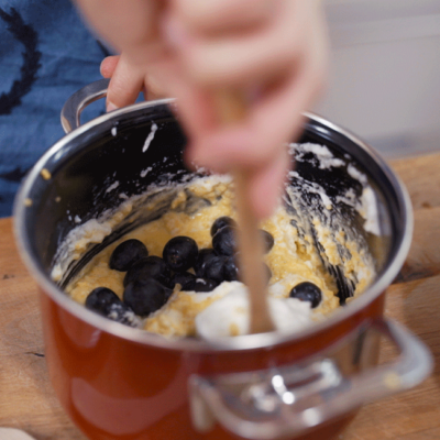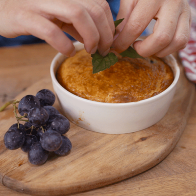 6Die Trauben mit dem Eischnee unter die Auflaufmasse heben. Die Auflaufmasse in die gefetteten Formen geben und im heißen Ofen ca. 30 Minuten goldgelb backen.