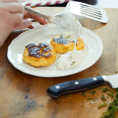 1Die Erdäpfel mit der Schale kochen, anschließend schälen und noch heiß mit einer Gabel zerstampfen. Dann auskühlen lassen.