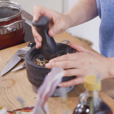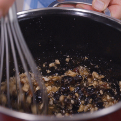 1Zuerst den Nuss-Mix in einer Mörser zerstampfen. Danach die getrockneten Pflaumen in kleine Stücke schneiden.