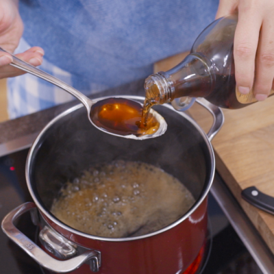 2In einem Topf Butter und Ahornsirup aufkochen lassen.