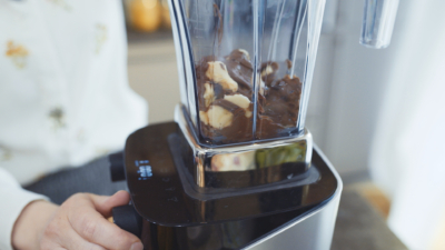 5Für die Dekoration klein geschnittene Bananen und Nougatcreme in einem Hochleistungsmixer vermengen.