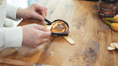 3Dann vorsichtig den Teig hineingießen und eventuell eine Holzspachtel aus der Apotheke in den noch flüssigen Pancake tauchen. Damit kann der Pancake später ohne Besteck gegessen werden. Wenden nicht vergessen!