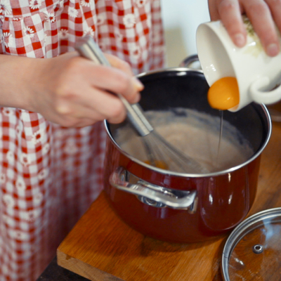 3Das Eigelb verquirlen und schnell unter den Grieß einrühren.