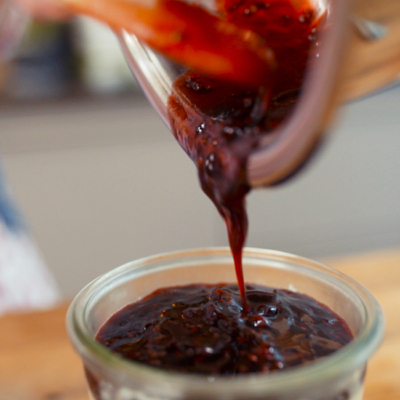 7Johannisbeersirup in einem Topf erwärmen und Ribisel dazu geben. Das ganze etwas aufkochen lassen.