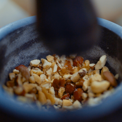 2Die Pfirsiche in Würfel schneiden, die Nüsse im Mörser ein wenig zerstampfen oder mit einem Messer zerkleinern.