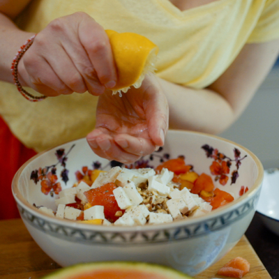 3Den Feta ebenfalls in kleine Würfel und alles zusammengeben.
