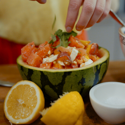 1Die Wassermelone halbieren und aus einer Hälfte mundgerechte Stücke herausschneiden.