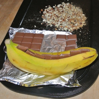 7Bananen herausnehmen, Alufolie öffnen und mit den vorbereiteten Nüssen bestreuen. Eventuell mit Nougatcreme garnieren. Sie werden in der Alufolie serviert und einfach aus der Schale gelöffelt.