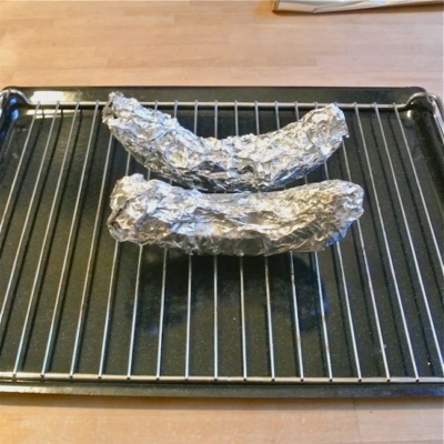4Nun die Bananen ähnlich wie Folienkartoffel gut in Alufolie einwickeln und die Folie an den Enden zusammendrehen.