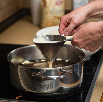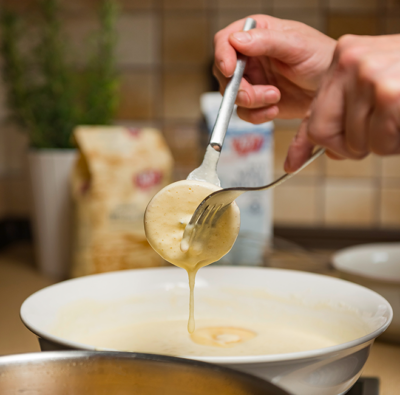 2Mehl salzen, mit Milch, Dotter und Rum zu einem dickflüssigen Teig verrühren.