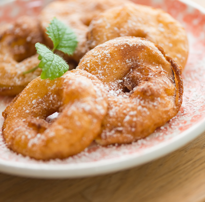 4Die Apfelringe durch den Backteig ziehen und im tiefen Fett schwimmend heraus backen. Man kann die Apfelradl auch in der Pfanne heraus braten.