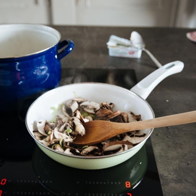 3Olivenöl erhitzen, Lauch darin anbraten. Die Champignons zugeben und mit Gemüsebrühe aufgießen. Kurz reduzieren lassen und den Frischkäse unterrühren.