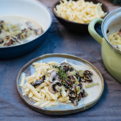 4Mit frischem Thymian, etwas Muskat, Salz und Pfeffer abschmecken. Die Creme-Champignons zu den Spätzle servieren.
