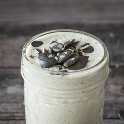 4Den Kürbiskern-Buttermilch Shake in zwei Gläser füllen.