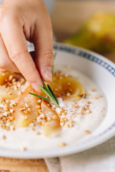 Birne-Zimt-Joghurt mit pochierten Birnen und geröstetem Buchweizen