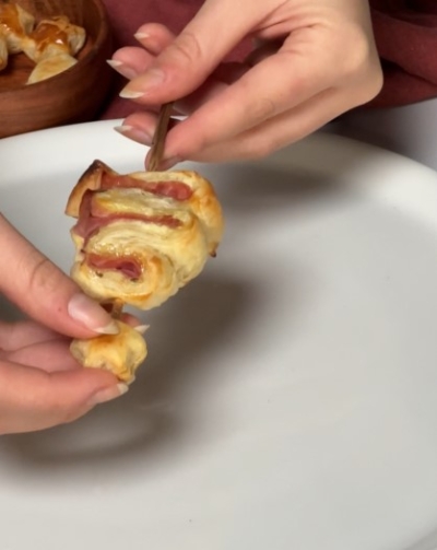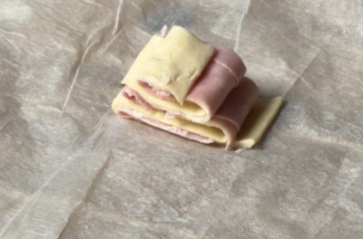 3Den größeren Teil des Bio-Blätterteigs großzügig mit Bio-Frischkäse und Bio-Schinken belegen. Nun 10 gleichbreite Streifen auf der langen Seite schneiden.