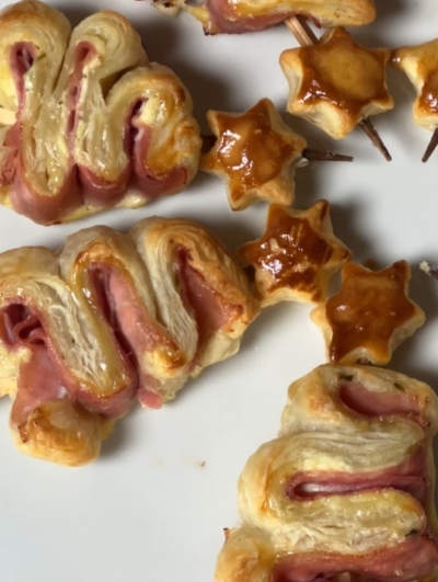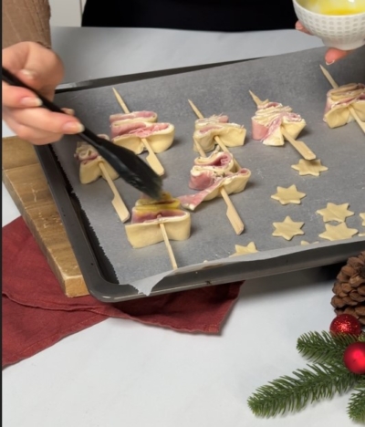 7Die ausgestochenen Sterne auf das Backblech legen und ca. die Hälfte der Zeit der Blätterteig-Weihnachtsspieße im Ofen mitbacken.