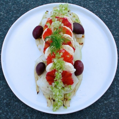 8Je zwei Scheiben vom gegrillten Fenchel auf einem Teller anrichten, leicht pfeffern, gehobelten Fenchel darauf drapieren und abwechselnd Blutorangenscheiben und Mozzarella auf dem Fenchelbett aneinander schichten. Nun noch etwas Olivenöl darüber träufeln.