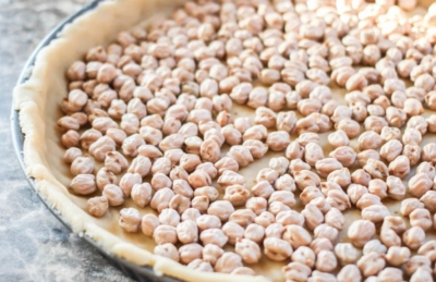 4Eine Gabel zur Hand nehmen und damit den Boden der Tarte mehrmals einstechen. Die Hülsenfrüchte auf dem Tarteboden verteilen und bei 180°C für etwa 10 Minuten im Backrohr „blindbacken“.