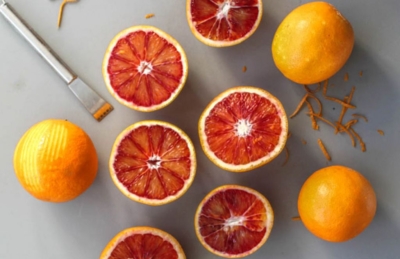 5In der Zwischenzeit den Guss zubereiten. Dazu die 5 Eier mit dem Feinkristallzucker mittels Handrührgerät schaumig schlagen. Schale der Blutorangen abreiben, Blutorangen entsaften. Die Maisstärke im Orangensaft glattrühren, dann den Saft, die Schale und das Schlagobers unter die Eimasse mischen.