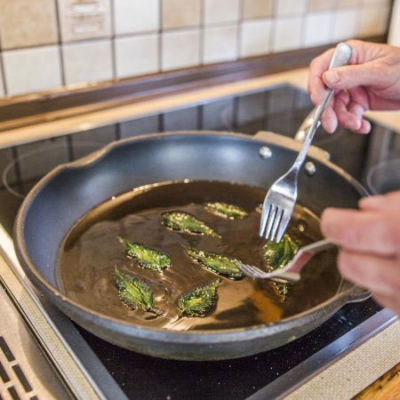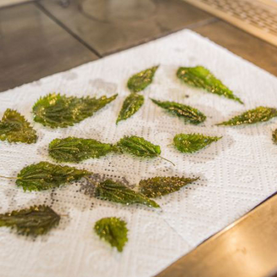 2Die Blätter in einer Bratpfanne mit wenig Fett sanft frittieren (die Blätter sollen grün bleiben)