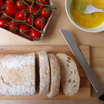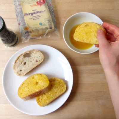 2Ciabatta in ca. 1,5 cm dicke Scheiben schneiden. Paradeiser an der Rispe lassen, waschen und jeweils einmal mit der Gabel anstechen.