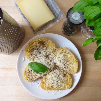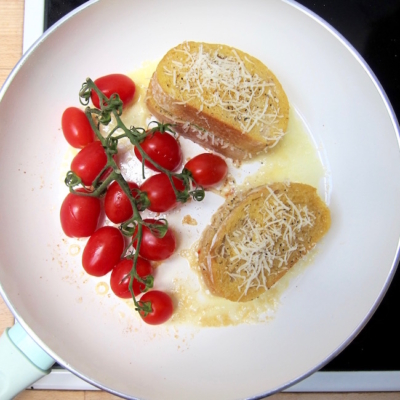 4Die zusammengesetzten Pofesen in die Pfanne geben und etwas zusätzlichen Käse für die knusprige Kruste darüber reiben. Die Paradeiser an der Rispe zu den Pofesen in die Pfanne setzen.
