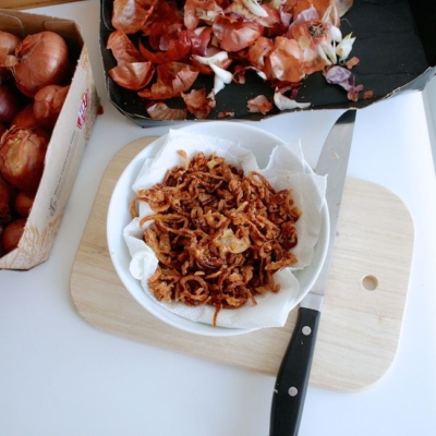 1Zuerst bereite ich die Röstzwiebel vor. Es bietet sich an, gleich mehr zu machen, sie halten sich gut getrocknet locker ein paar Tage. Schalotten in feine Streifen schneiden, einsalzen und 5 Minuten stehen lassen. So entziehe ich ihnen etwas Wasser. Dann auf Küchenpapier abtrocknen und rundherum mit Mehl einstäuben.