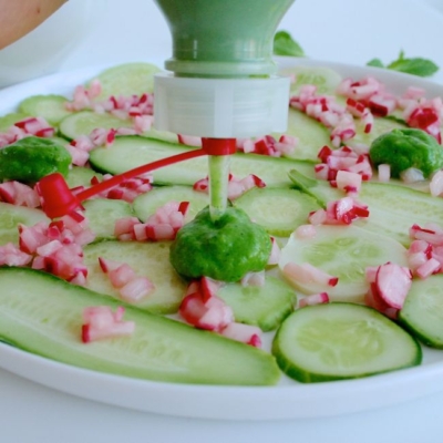 8Darüber kommt die Radieschenvinaigrette. Die Erbsencreme portioniere ich mit praktischen wiederverwendbaren Quetschflaschen in mehreren kleinen Tupfen, es funktioniert aber auch mit einem Spritzbeutel oder Teelöffel. Auf die Erbsencreme gebe die Röstzwiebel.