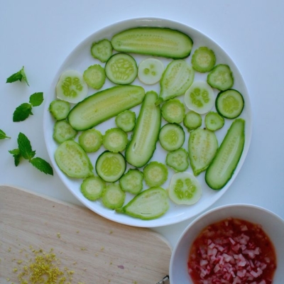 7Die Gurkenraritäten schneide ich in hauchdünne Scheiben – mal längs, mal quer – um die Vielfalt auch optisch voll zur Geltung zu bringen und verteile die Scheiben auf den Tellern, ohne dass sie überlappen.