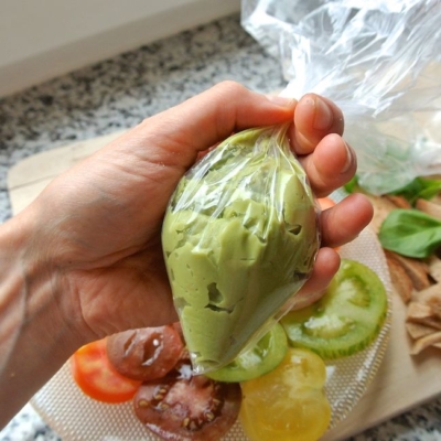 7Für die Avocadocreme eine Avocado mit dem restlichen Zitronensaft, Salz und Pfeffer pürieren. Als Spritzbeutel verwende ich einen kleinen Gefrierbeutel, von dem ich eine Spitze abschneide. Das Befüllen klappt am einfachsten, wenn Ihr den Gefrierbeutel mit einer Spitze nach unten in ein kleines Glas gebt und den Beutel dann oben zusammendreht. Wer einen Spritzbeutel hat, kann natürlich diesen verwenden.