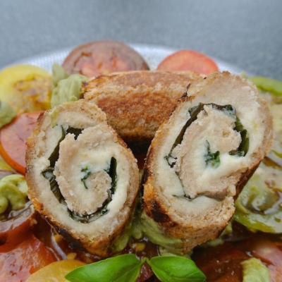 10Aus der Pfanne nehmen und je 2 Röllchen auf den Paradeiserscheiben anrichten, diese mit Hilfe des Spritzbeutels mit der Avocadocreme garnieren. Die Enden der Röllchen decke ich auch mit etwas Avocadocreme ab. Zu guter Letzt kommen noch ein paar Basilikumblätter und die bereits entkernten Kalamata Oliven auf die Teller.